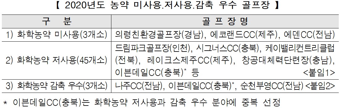 전국의 골프장 541개소를 대상으로 2020년 기준 화학농약 사용실태를 조사하여 화학농약을 사용하지 않았거나 사용량이 적은 골프장 50개소를 '화학농약 사용 저감 우수 골프장'으로 선정했다고 밝혔다.