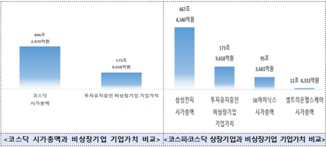 투자 유지 중인 비상장기업의 기업가치 약 174조원은 지난해 말 기준 코스닥 상장기업 전체 시총 446조 2970억원의 약 39.0%이다.
