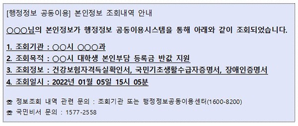 또한 행정정보 공동이용 과정에서 본인의 행정정보가 조회되면 국민비서 ‘본인정보 조회내역 알림’을 신청한 사람을 대상으로 즉시 민원인명, 조회기관, 조회목적, 조회정보, 조회일시를 안내한다.