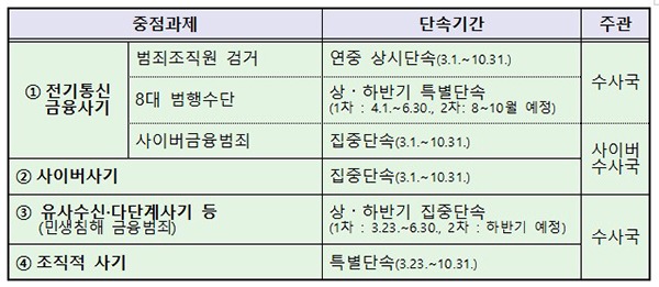 전기통신금융사기의 경우 국내외 전화금융사기 총책 등 범죄조직원 집중검거를 위해 상시 단속체계를 운영하고, 해마다 피해 규모가 늘고 있는 메신저피싱·몸캠피싱 등 사이버금융범죄에 대해서도 집중단속을 벌일 예정이다.