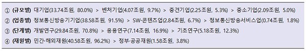 2020년 ICT 기업의 연구개발비 총 42조 1600억원 중 80%에 해당하는 33조 7400억원은 대기업의 투자로 가장 높은 비중을 차지했다.