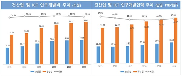 2020년 국내 ICT기업들의 연구개발비 투자는 전년도 41조 4400억원보다 1.7% 증가한 7200억원이 더해져 총 42조 1600억원인 것으로 조사됐다.