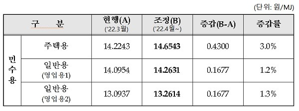 이번 요금인상에 따라 1일부터 주택용 요금은 현행 메가줄(MJ)당 14.22원에서 0.43원 인상된 14.65원으로, 일반용(영업용 1) 요금은 공급비 인하 요인을 감안해 0.17원 상승한 14.26원으로 인상된다.