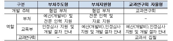 교과서 개발 주체와 참여 역할에 따라 ‘부처주도형’, ‘부처지원형’, ‘교과연구회 자율형’으로 나눠 개발하며, 서울시교육청 주관으로 교과서 편찬 전문기관을 공모로 선정해 교과서 집필·검토를 체계적으로 관리해 나간다.