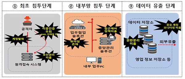 최근 발생했던 여러 국내·외 침해사고에 대한 분석을 종합해보면 외부로부터의 사이버 공격 단계는 최초 침투 단계, 내부망 침투 단계 및 데이터 유출 단계 등 3단계로 나눌 수 있다.