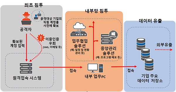 최초 침투 단계에서 해커는 공격대상 기업의 사용자 계정 등을 다크웹 등에서 구입하거나 업무 관련으로 위장한 악성 메일을 보내 계정을 수집하는 등 다양한 방식을 활용했으며, 일회용 비밀번호 등의 추가 계정 인증 요구도 우회하는 형태를 보였다.