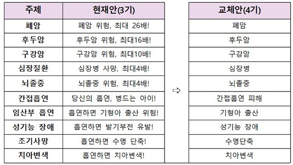 한편 이번에 마련한 제4기 경고그림 및 문구(안)은 고시개정안에 대한 행정예고를 거쳐 최종 확정하며, 6개월의 유예기간 경과 후 오는 12월 23일부터 시행될 예정이다.