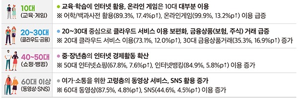 인터넷 서비스 활용처의 경우 10대는 교육과 온라인 게임, 20~30대는 클라우드와 금융상품 거래, 40~50대는 인터넷쇼핑·뱅킹, 60대 이상은 동영상·SNS 이용에서 두드러진 특징을 보였다.
