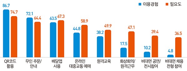 온라인 대중교통 예매(44.8%), 원격교육(38.2%), 화상회의·원격근무(17.5%), 비대면 공연·전시(10.2%)의 경우 상대적으로 이용 경험은 낮지만 그에 비해 필요성은 높게 체감하는 것으로 나타났다.