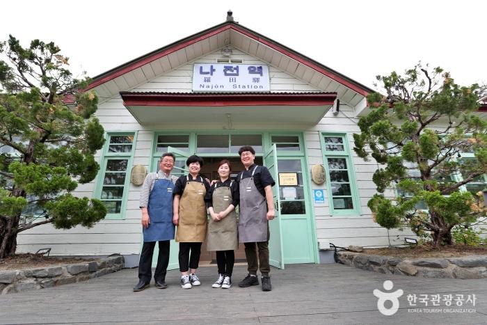 나전역카페는 문을 열고 내부를 확인하기 전에는 카페라는 걸 알기 어렵다. 역사를 카페로 만들면서 세운 첫 번째 원칙 때문이다. 바로 원형을 그대로 유지한다는 것인데, 옛날의 나전역 사진과 비교를 해봐도 거의 변화가 없다. 내부 역시 기차표를 발권하던 창구를 주방으로 변신시키기만 했다. 기차역의 상징이라고 할 수 있는 민트색 창틀과 ‘타는 곳’, ‘나가는 곳’ 같은 표지판, 오래된 난로, 하얀 벽에 걸린 태극기, 열차 시간표와 비둘기호 승차권 등 나전역카페 내부의 면면들은 향수를 느끼게 한다.