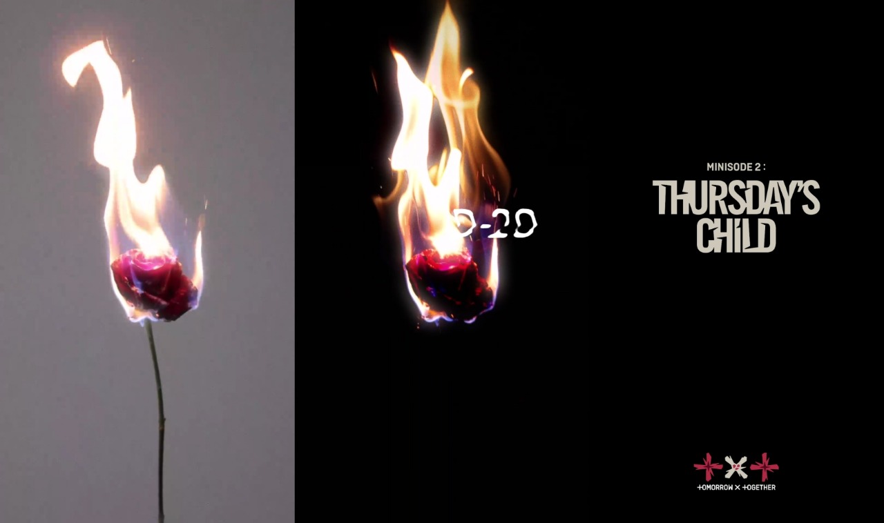 투모로우바이투게더(수빈, 연준, 범규, 태현, 휴닝카이)는 19일 자정 공식 SNS에 미니 4집 ‘minisode 2: Thursday's Child’의 콘셉트 티저를 깜짝 공개했다. 공개된 영상에는 한 송이의 장미가 불타는 모습 위로 ‘D-20’이라는 문구가 뜨고, 마지막으로 신보 이름인 ‘minisode 2: Thursday's Child’와 투모로우바이투게더의 새로운 로고가 나타난다.