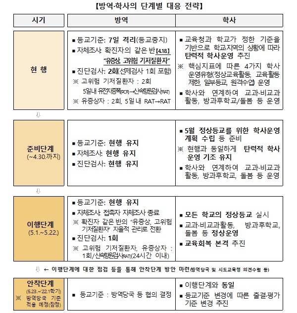 교육부는 안정적인 방역 및 학사운영 체계 전환을 위해 ▲준비단계(4월 21~30일) ▲이행단계(5월 1~22일) ▲안착단계(5월 23일~1학기)를 거쳐 교육활동을 정상화해 나간다.