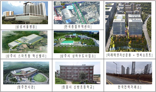 8개 시범사업 대상기관은 삼성서울병원·㈜더블유티씨서울·미래에셋자산운용·상주시·㈜엔씨소프트·한국전력거래소·충북·경남교육청이며 이들 기관의 건축물 9곳에 수열에너지가 보급된다.