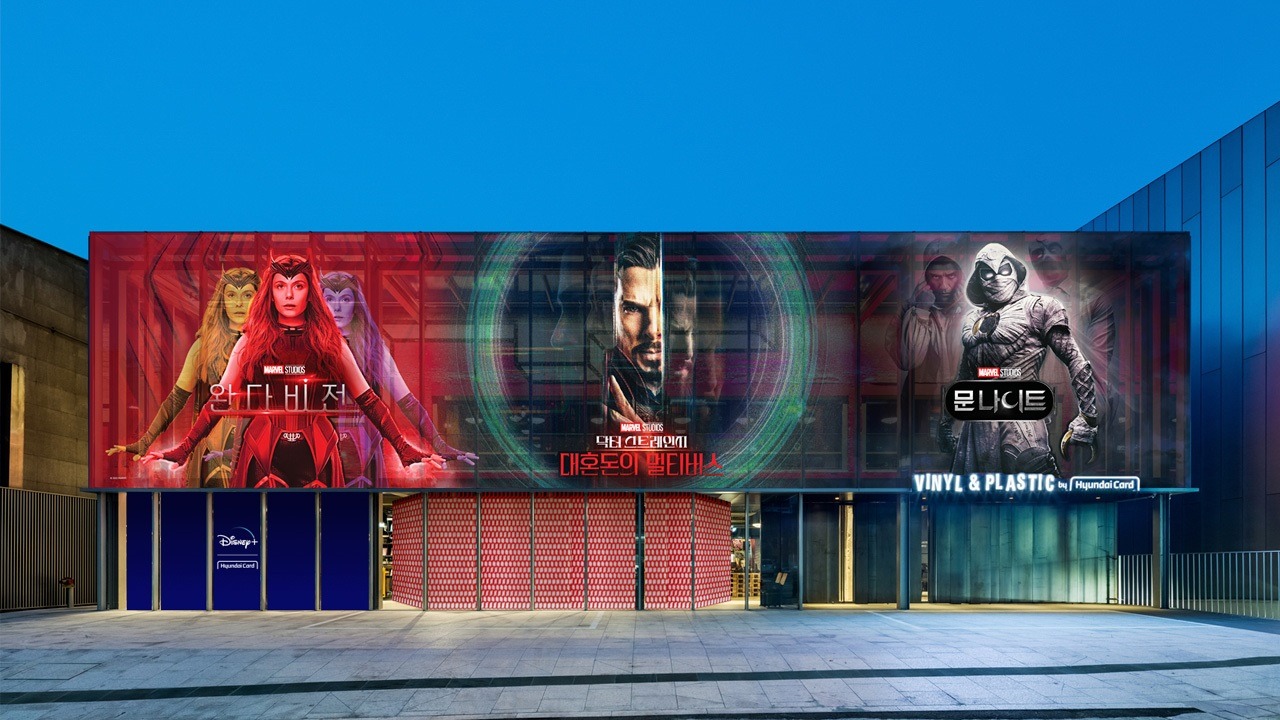 현대카드와 디즈니코리아는 바이닐앤플라스틱 건물 전면을 마블 캐릭터를 담은 대형 브랜드 파사드 작품으로 장식해 입장하기 전부터 강렬한 몰입감을 느낄 수 있게 했다.