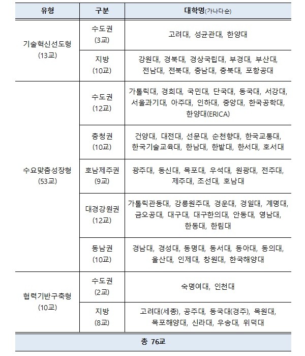 교육부와 한국연구재단은 지난 1월 13일 기본계획 발표 및 사업 공고 이후 지난달 3일까지 사업계획서를 접수 받았다. 이후 서면 및 발표 평가를 거쳐 사업 수행대학 총 76개교를 최종 선정했다.