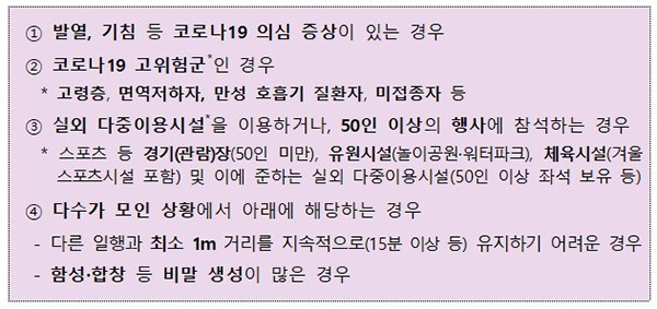 특히 코로나19 유증상자·고위험군, 실외 다중이용시설, 50인 이상 행사, 다수가 모여 거리 지속 유지가 어렵거나 비말 생성이 많은 환경에 해당하면 실외에서도 마스크 착용을 적극 권고한다.