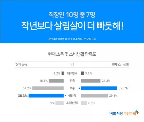 생활밀착 일자리를 제공하는 벼룩시장구인구직(대표 장영보)이 성인 남녀 491명을 대상으로 설문 조사한 응답자 10명 중 7명은 ‘지난해에 비해 생활여건이 나아지지 않았다(68.2%)’고 답했다.