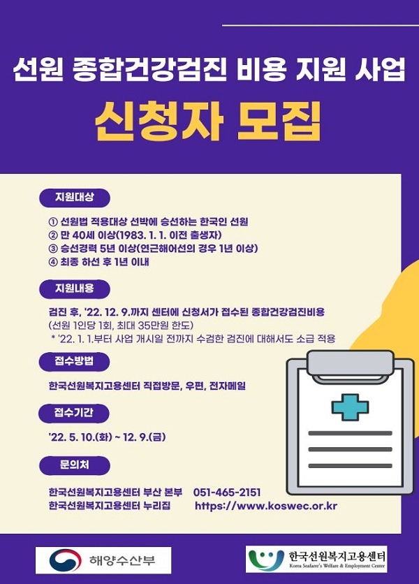 김석훈 해수부 선원정책과장은 “종합건강검진 비용 지원 사업을 통해 선원의 건강증진은 물론 직업안정에도 기여할 것으로 기대된다”며 “앞으로도 선원의 건강이 보호될 수 있도록 다양한 방식의 의료복지서비스를 확대해 나가겠다”고 말했다.