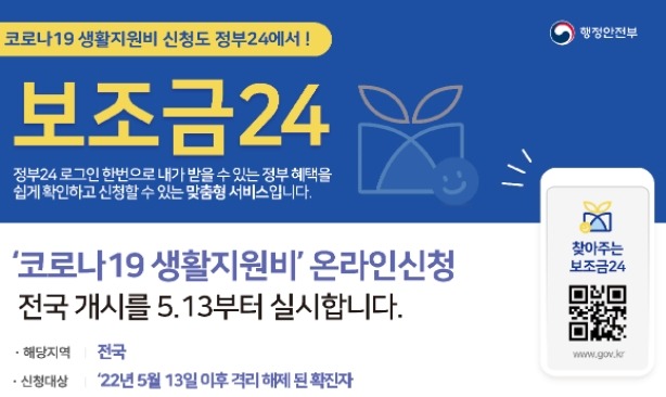 행정안전부와 질병관리청은 5월 13일(금)부터 정부24 누리집 또는 모바일앱을 통해 코로나19 확진자에 대한 ‘생활지원비 신청 온라인 서비스’를 개시한다고 밝혔다.
