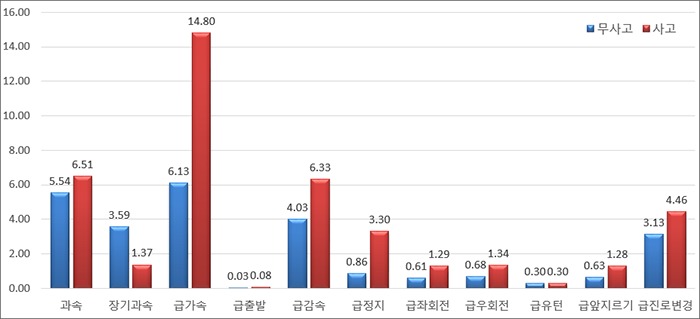 유형별로는 급가속이 14.8건(무사고 운전자의 2.41배)으로 가장 높았으며, 과속 6.51건(무사고 운전자의 1.18배), 급감속 6.33건(무사고 운전자의 1.57배) 순이었다.