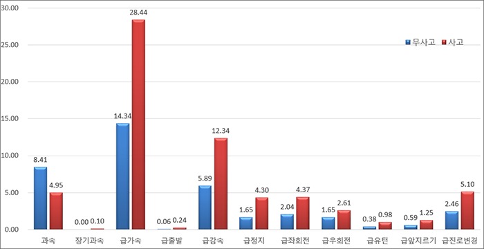 유형별로는 급가속이 28.44건(무사고 운전자의 1.98배)으로 가장 높았으며, 급감속 12.34건(무사고 운전자의 2.1배), 급진로변경 5.1건(무사고 운전자의 2.08배) 순이었다.