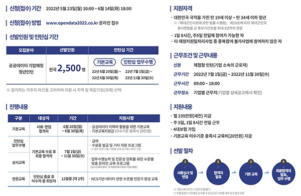 행정안전부는 ‘2022년 공공데이터 기업연계(매칭) 청년인턴 지원사업’ 참가 희망자 2500명을 23일부터 오는 6월 14일까지 모집한다고 밝혔다.