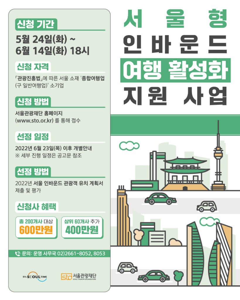 서울시는 서울시에 등록된 종합여행업 소기업을 대상으로 『서울 인바운드 관광객 유치계획』을 평가하여, 총 200개사를 지원대상으로 선정한다. 선정된 업체에는 최대 6백만 원의 관광객 유치비용을 지원하고, 평가 결과에 따라 상위 60개의 우수여행사에는 최대 4백만 원까지 추가로 지원할 계획이다. 지원금액은 총 15억 원 규모이다.