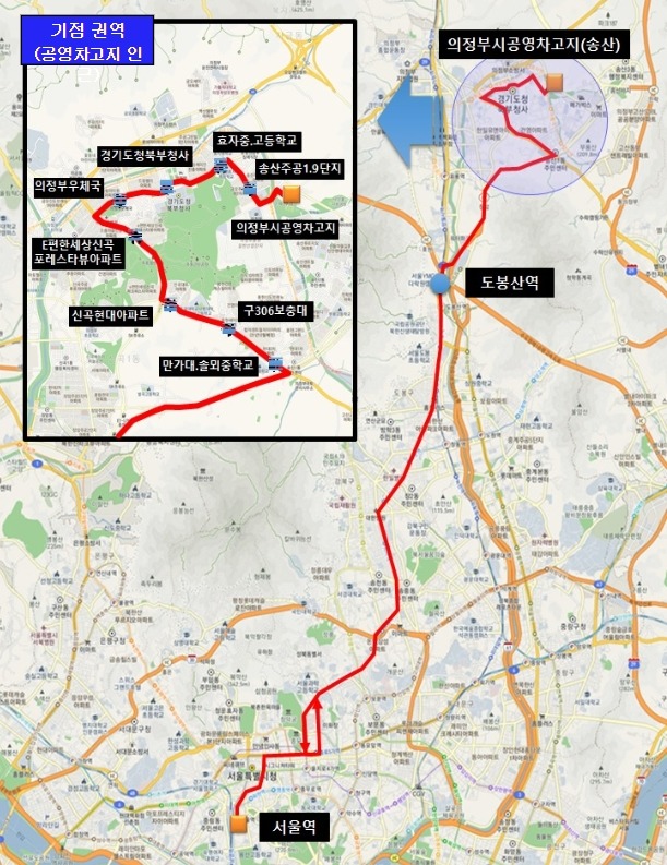 상·하행 주요경로는 효자중·고교, 경기도청북부청사, 구306보충대 등 의정부지역 9개 정류소를 거쳐 도봉산역에서 서울역으로 직결되는 노선으로 서울시내 정차 정류소를 대폭 축소하여 통행시간 단축에 주안점을 둔 노선이다.