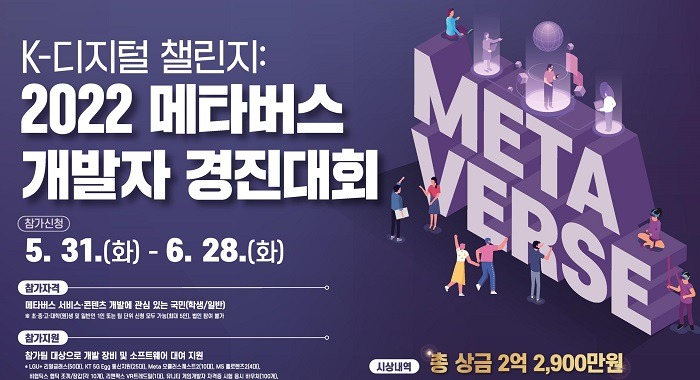 과학기술정보통신부(이하 ‘과기정통부’)는 국민 누구나 참여해 메타버스 콘텐츠·서비스 개발 실력을 겨루는 「케이(K)-디지털 챌린지 : 2022 메타버스 개발자 경진대회」를 개최한다고 밝혔다.