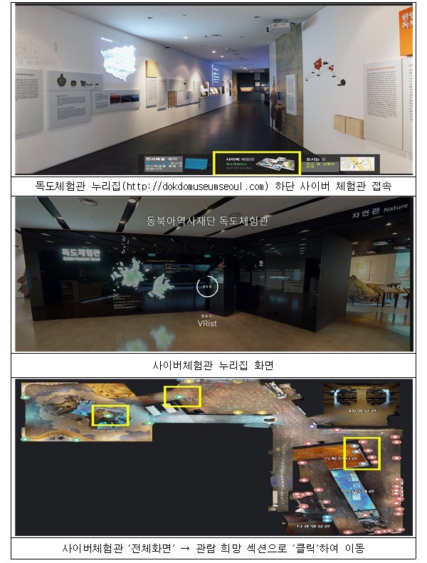 독도에 대한 역사 기록과 지도 등을 전시하는 역사관, 독도의 생태 자연환경을 안내하는 자연관을 비롯해 영상체험관, 기획전시관 등 독도전시관 전체가 360도 가상현실 콘텐츠로 제작됐다.