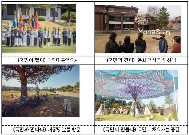 4가지 주제는 국민의 첫걸음을 맞이하는 군악대·의장대의 환영식을 볼 수 있는 ‘①국민이 열다’, 문화와 역사를 살펴보는 ‘②국민과 걷다’, 대통령실을 가장 가까이에서 볼 수 있는 ‘③국민과 만나다’, 드넓게 펼쳐진 광장에서 미래 용산공원의 모습을 채워가는 ‘④국민이 만들다’ 등이다.