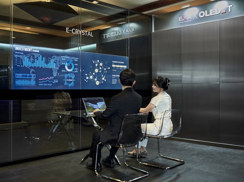국내 인테리어 전문 기업 ‘엑사이엔씨’와 협업한 ‘회의실용 투명 OLED 솔루션(모델명: E 크리스탈)’은 회의실 유리벽에 투명 OLED를 내장해 벽 자체를 디스플레이로 활용할 수 있는 제품이다.