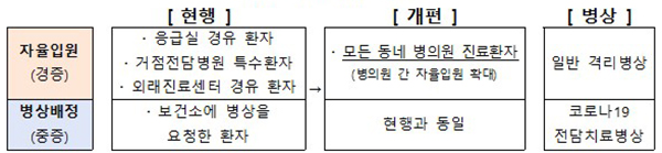 입원치료가 필요한 중증환자는 코로나19 전담치료병상에 입원하는 체계를 유지한다. 경증 환자는 동네 병·의원 의사의 진단 이후 일반적인 입원의뢰체계를 통해 일반 격리병상으로 자율입원하도록 한다.