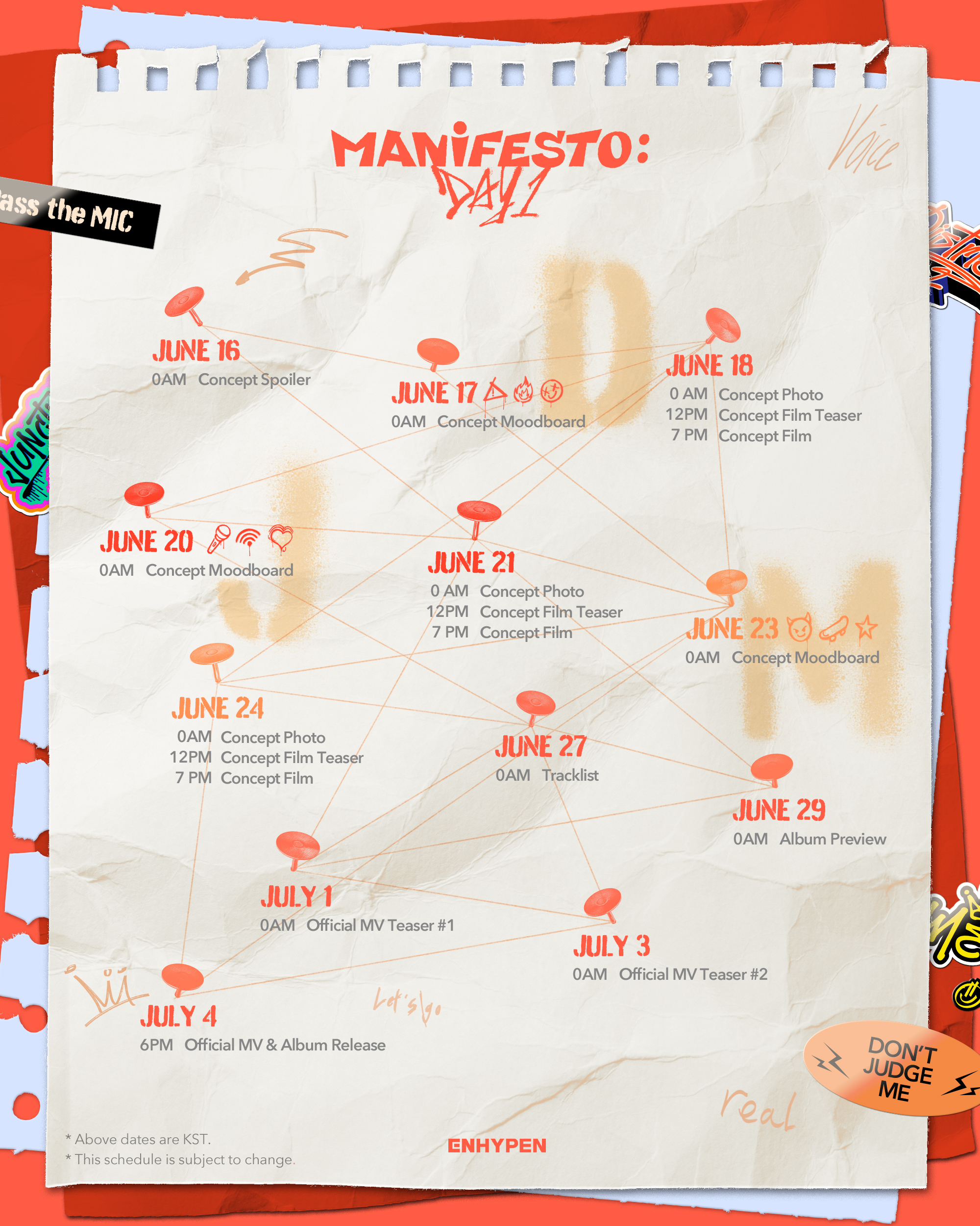 ENHYPEN(정원, 희승, 제이, 제이크, 성훈, 선우, 니키)은 지난 14일 18시 공식 SNS에 미니 3집 ‘MANIFESTO : DAY 1’의 프로모션 캘린더를 게재했다. 뜯어진 종이 위에는 앨범명과 다양한 콘텐츠 공개 일정이 적혀 있다. 특히, 캘린더에는 ‘DON’T JUDGE ME’라고 쓰인 스티커를 비롯해 ‘D’, ‘J’, ‘M’ 문구 등이 삽입되어 있어 그 의미에 대한 궁금증을 더했다.
