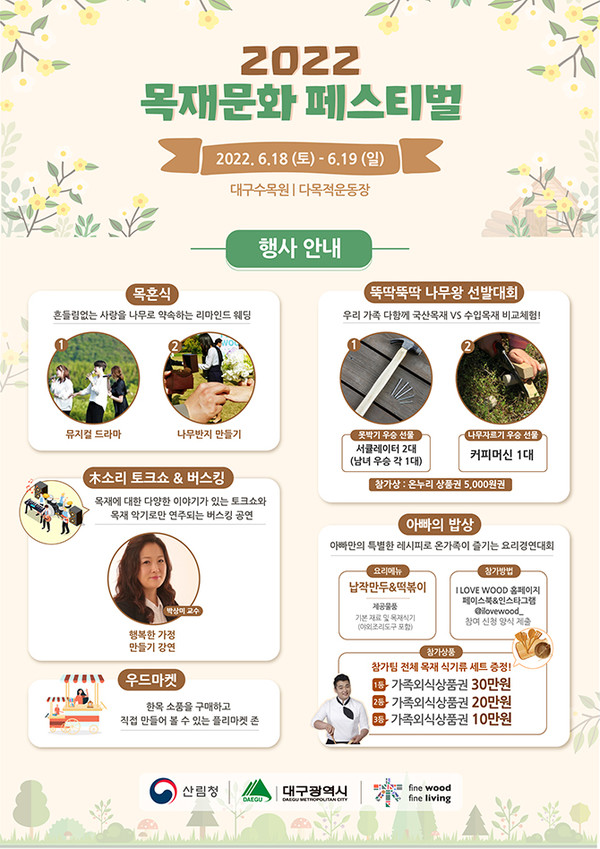 산림청은 기후변화를 해결해 줄 목재의 가치를 다시 알고 산림자원 선순환에 대한 인식을 높이기 위해 ‘생활 속 목재 이용으로 탄소중립 실현하기’를 주제로 2022 목재문화축제(페스티벌)를 18~19일 대구수목원에서 개최한다고 16일 밝혔다.