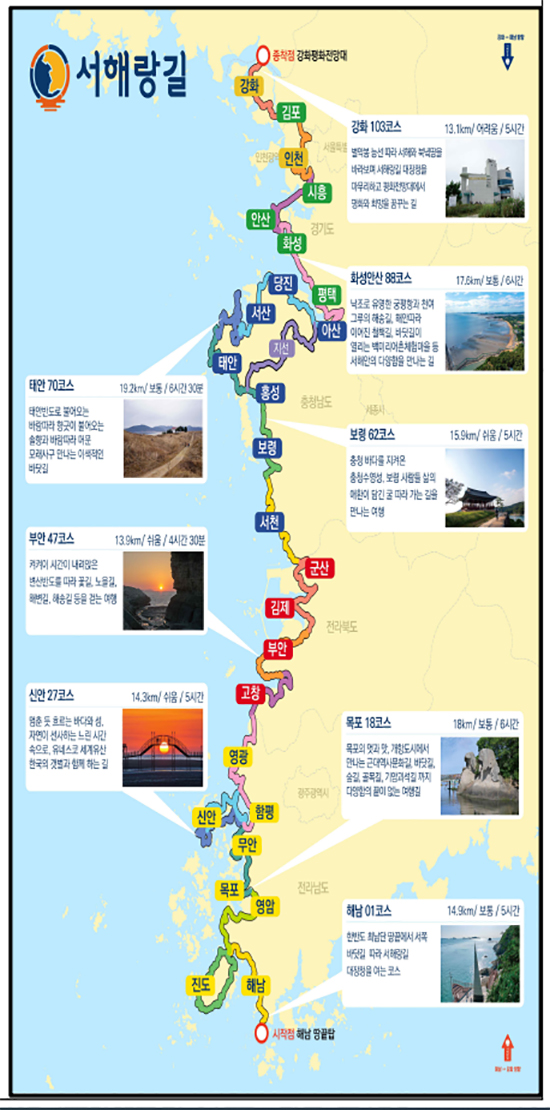 문화체육관광부는 한국관광공사와 함께 전남 해남부터 인천 강화까지 서해안에 인접한 31개 기초자치단체의 109개 걷기길 1800km 구간을 연결한 서해랑길을 연다고 22일 밝혔다.