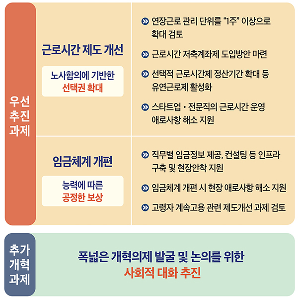 스타트업·전문직의 경우도 실제 근로시간 운영에서 근로자·사용자 모두에게 도움이 되는 방안을 검토한다. 이러한 제도개선 과제들이 근로자 건강권과 조화를 이룰 수 있도록 건강보호조치 방안도 함께 마련한다.