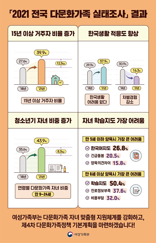 여가부는 실태조사 결과를 바탕으로 다문화가족 정책방향과 비전을 제시하고 학령기 자녀 맞춤형 교육·돌봄 체계를 담아 ‘제4차 다문화가족정책 기본계획(2023~2028)’을 수립할 예정이다.