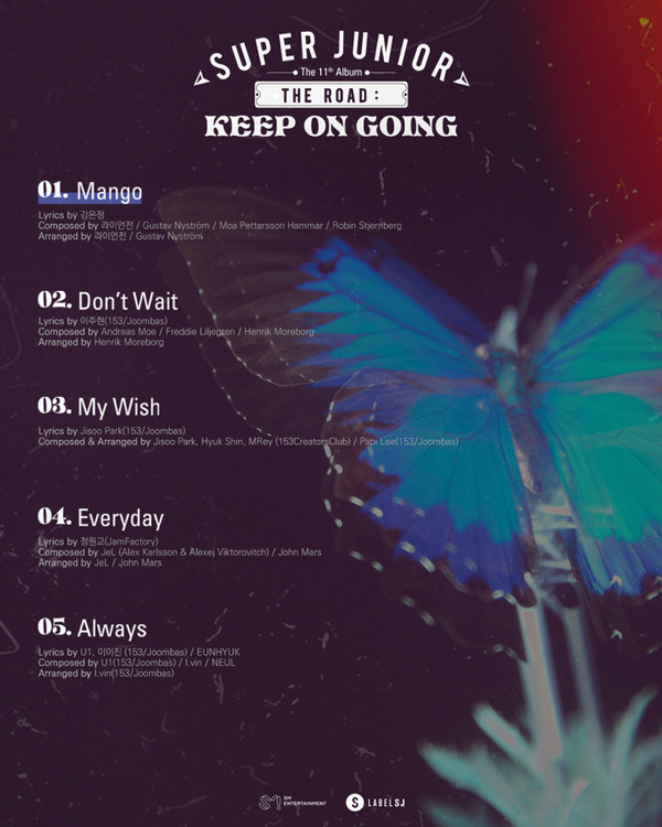 슈퍼주니어는 오는 7월 12일 오후 6시 국내외 전 온라인 음원 사이트를 통해 정규 11집 Vol.1 앨범 'The Road : Keep on Going'을 발매하고, 타이틀곡 'Mango'로 새로운 활동을 시작한다.