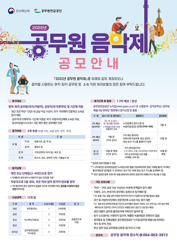 인사혁신처와 공무원연금공단은 다음 달 3일부터 18일까지 16일간 공무원 음악제 출품 작품을 공모한다고 5일 밝혔다.