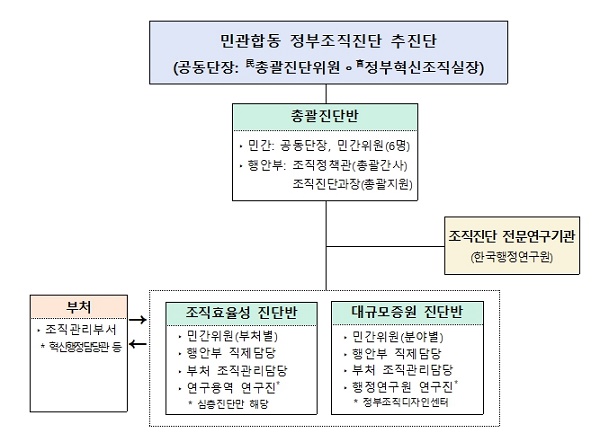 추진단은 조직진단 전반을 기획·총괄하는 총괄진단반과 부처별 현장 진단반으로 구성한다. 현장 진단은 정부행정·정책 연구·현장 경험이 풍부한 교수·연구원·상담사(컨설턴트) 등 다양한 분야의 민간 전문가와 행안부 및 각 부처 조직관리 담당공무원이 협업해 진행한다.