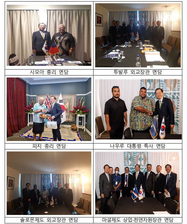 해수부에 따르면 조 장관은 10일 피아메 나오미 마타아파 사모아 총리와 면담을 가졌다. 이어 사이먼 코페 투발루 외교장관, 조세이아 보렝게 바이니마라마 피지 총리, 아스테리오 아피 나우루 대통령 특사(외교차관), 제레미야 마넬레 솔로몬제도 외교장관, 존 실크 마셜제도 상업·천연자원장관, 마크 아티 바누아투 외교장관과 면담을 진행했다.
