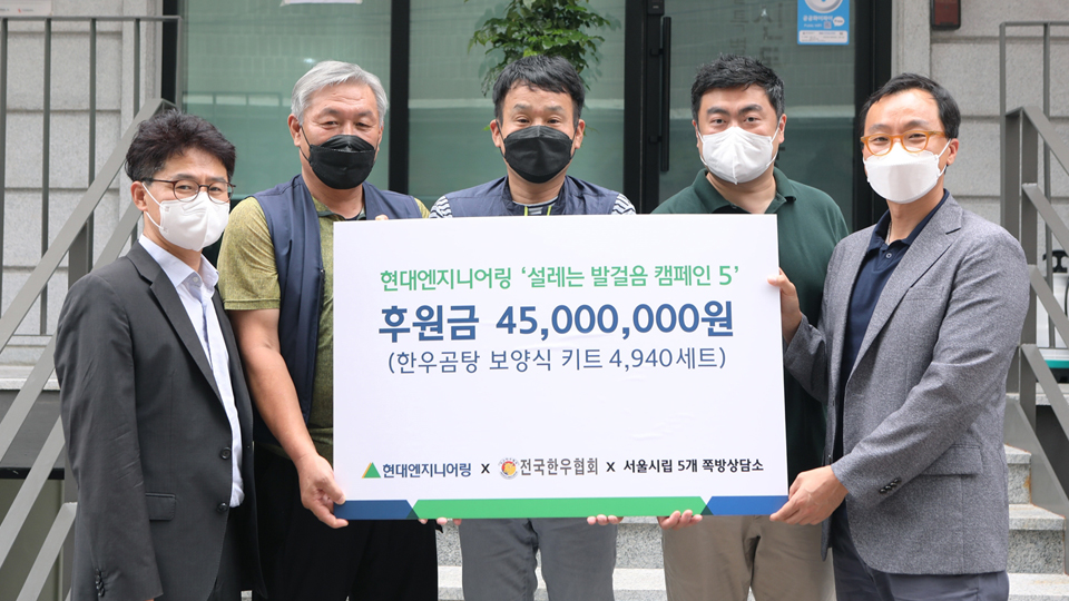 현대엔지니어링은 전국한우협회와 함께 돈의동, 창신동, 남대문, 서울역, 영등포 등 서울시 5개 지역 쪽방촌 주민에게 4,500만 원 상당의 보양식 키트를 기증하는 물품후원 전달식을 가졌다고 12일 밝혔다.