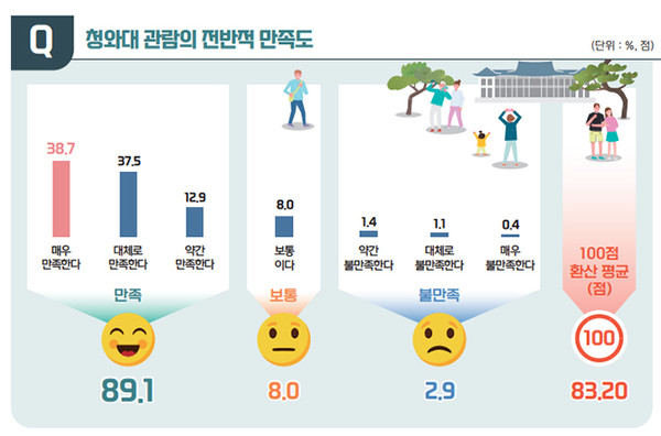 가장 만족스러운 점으로는 청와대 경내 산책 및 조경 관람(61.8%), 본관과 영빈관 등 실내 관람(28.3%) 등을 꼽았다.