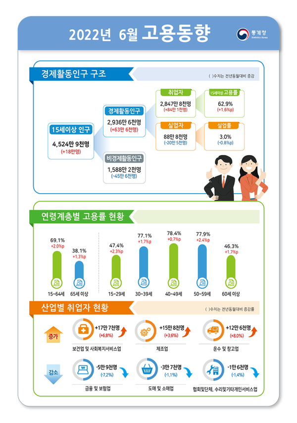 15세 이상 고용률은 62.9%로 1년 전보다 1.6%p 올랐다. 경제협력개발기구(OECD) 비교 기준인 15~64세 고용률은 69.1%로, 2.0%p 상승했다. 두 고용률 지표 모두 각각 1982년 7월, 1989년 1월 통계 작성 이래 6월 기준 역대 최고치다.
