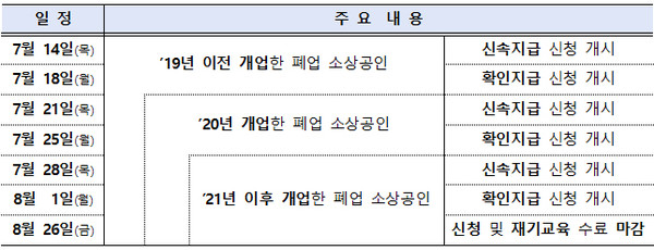 국세청 DB를 통해 사전선별된 ‘신속지급’ 대상의 경우 개업일이 2019년 이전인 폐업 소상공인은 14일부터, 2020년인 경우는 오는 21일부터, 2021년 이후인 경우는 28일부터 신청이 가능하다.