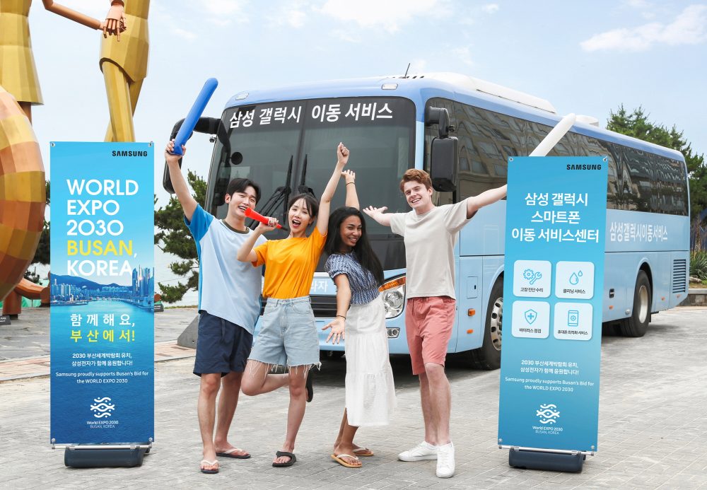 또한, 민·관 합동 ‘2030 부산세계박람회 유치위원회’의 일원인 삼성전자는 이동 서비스센터에서 엑스포 유치를 기원하는 광고물을 통해 국내외 방문객들에게 ‘함께해요, 부산에서!’라는 메시지를 전한다.
