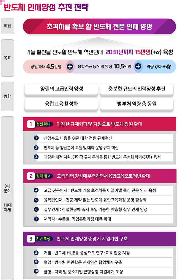 이에 교육부는 향후 10년 동안 반도체 인재 15만 명을 양성하기로 했다. 이를 위해 ▲과감한 규제혁파 및 지원으로 반도체 정원 확대 ▲고급 인력 양성에 주력하면서 융합교육으로 저변 확대 ▲반도체 인재양성 중장기 지원기반 구축 등 3대 분야 10대 과제를 설정해 전략적으로 대응한다.