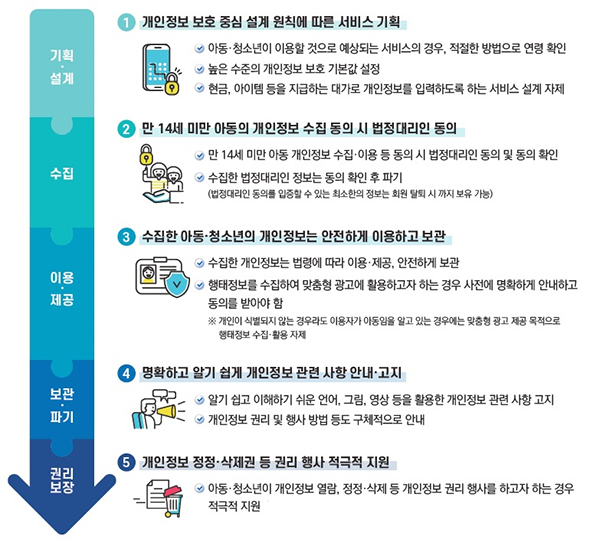 아동·청소년을 개인정보의 주체로 인식하고 이들의 개인정보 자기결정권 존중, 아동·청소년 최선의 이익 고려 등 아동·청소년 개인정보 보호에 기본이 되는 5대 원칙을 마련했다.