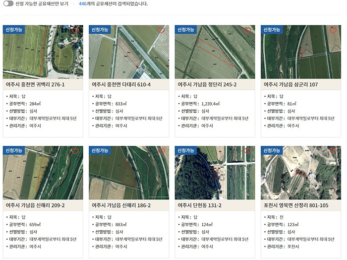경기도가 현재 행정 목적으로 사용하고 있지 않은 도유재산 가운데 일반 도민에게 빌려줄 수 있는 땅을 공유시설 예약 플랫폼인 경기공유서비스(share.gg.go.kr)에 공개하고, 온라인으로 대부신청을 받는다고 25일 밝혔다.
